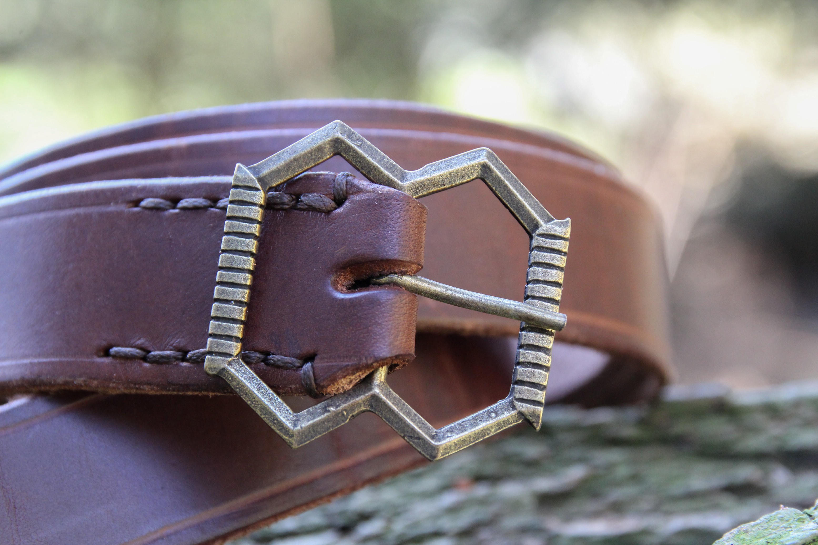 Tato symetrická přezka je zdobena horizontálním drážkovaným vzorem po obou stranách. Kožený gotický opasek odpovídá časovému období 14. století.